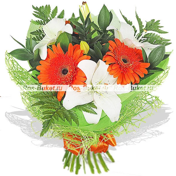ЛЮКС: лилия белая - 2 шт, гербера оранжевая  - 5 шт, рускус, папоротник - 5 шт, фетр розовый.